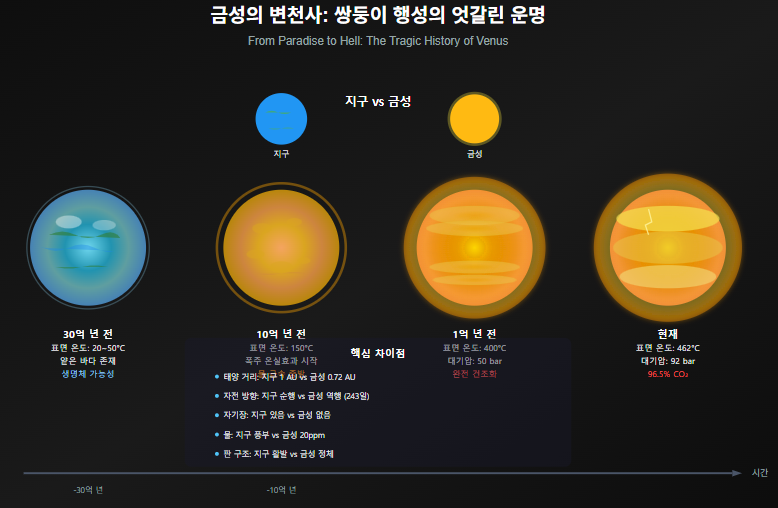 지구의 쌍둥이라 불렸던 금성은 왜 섭씨 462도의 지옥이 되었을까요? 금성과 지구는 크기와 질량이 거의 같고, 태양으로부터 비슷한 거리에 위치하며, 동일한 원시 성운에서 태어났습니다. 그러나 현재 금성은 납을 녹일 정도의 표면 온도, 지구 대기압의 92배에 달하는 압력, 황산 비가 내리는 극한 환경이 되었습니다. 폭주 온실효과가 어떻게 한때 바다를 가졌을 것으로 추정되는 금성을 완전히 변모시켰는지, 그리고 금성의 거꾸로 도는 자전과 하루가 1년보다 긴 기이한 현상의 원인을 탐구합니다. 최신 탐사 미션들이 밝혀낸 금성 대기의 포스핀 검출 논란과 과거 생명체 존재 가능성까지, 금성이 지구의 미래를 보여주는 거울일 수 있다는 경고와 함께 심층 분석합니다.